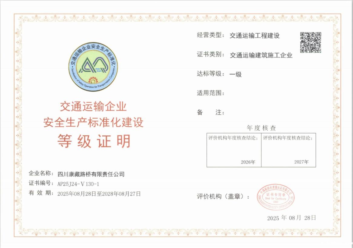 近日,经交通运输部交通运输企业安全生产标准化评价机构综合评定,康藏路桥公司获评安全标准化一级企业并取得证书,标志其安全生产管理体系获国家最高标准认可。