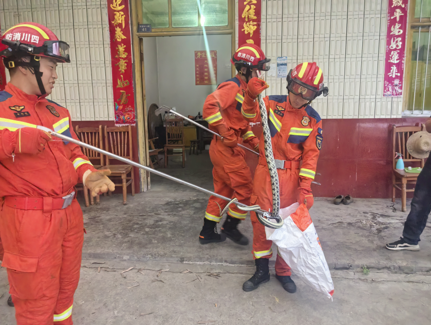 “我家床头柜下面有条大蛇!你们快来!”6月18日早上,雅安经开区消防救援大队筹备组接到群众报警,称家中闯入一条近2米长的菜花蛇,吓得全家人不敢进屋。消防员迅速赶到现场,只见蛇盘踞在床头柜角落,不时吐着信子。经验丰富的消防员戴好防护手套,利用捕蛇钳精准夹住蛇的七寸,成功将其捕获并带到野外放生。惊魂未定的住户连连道谢:“多亏你们,不然我们都不敢进屋睡觉了!”