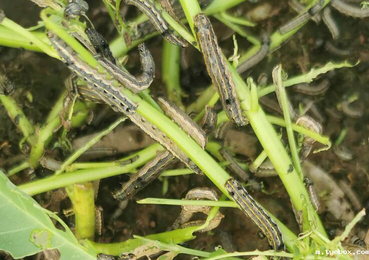 斜纹夜蛾是一种杂食性害虫,且食量大,幼虫体色变化很大,有淡绿色、黑褐色、土黄色三种,颜色变化与环境和发生量有关。在蔬菜中对白菜、甘蓝、芥菜、大豆、马铃薯、茄子、番茄、辣椒、南瓜、丝瓜、冬瓜、芋儿以及藜科、百合科等多种作物都能进行为害。它主要以幼虫为害全株、小龄时群集叶背啃食。3龄后分散为害叶片、嫩茎,老龄幼虫可蛀食果实。其食性既杂又为害各植物器官,老龄时形成暴食,是一种危害性很大的害虫。
