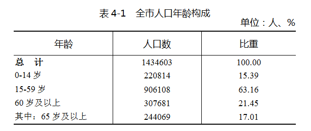 全市常住人口[2]中,0-14岁[3]人口为220814人,占15.39%;15-59岁人口为906108人,占63.16%;60岁及以上人口为307681人,占21.45%,其中65岁及以上人口为244069人,占17.01%。与2010年第六次全国人口普查相比,0-14岁人口的比重下降0.79个百分点,15-59岁人口的比重下降5.19个百分点,60岁及以上人口的比重上升5.98个百分点,65岁及以上人口的比重上升6.13个百分点。