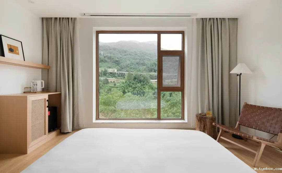 民宿有6间日系风房间,每一间都有落地窗,窗外都是不一样的风景。山里温度特别凉快,所以房间没有配备空调,有电风扇就够啦。
