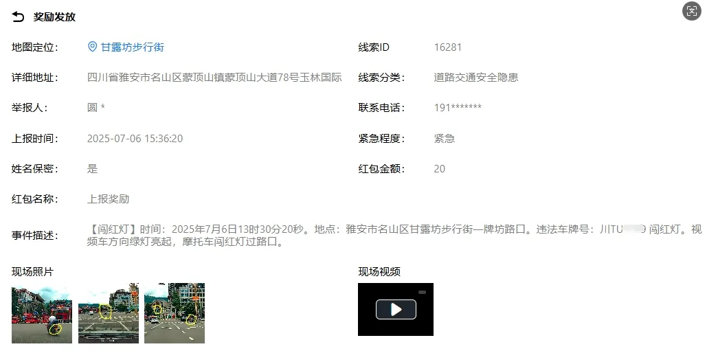 事件描述:雅安市名山区甘露坊步行街—牌坊路口,一辆车牌号为川TU***9 摩托车闯红灯