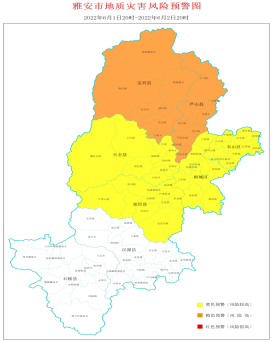 6月1日20时-6月2日20时,受“6.1”芦山、宝兴地震影响,结合气象预报情况,芦山县、宝兴县发生地质灾害的风险高(橙色预警),天全县、雨城区、名山区、荥经县发生地质灾害的风险较高(黄色预警)。
