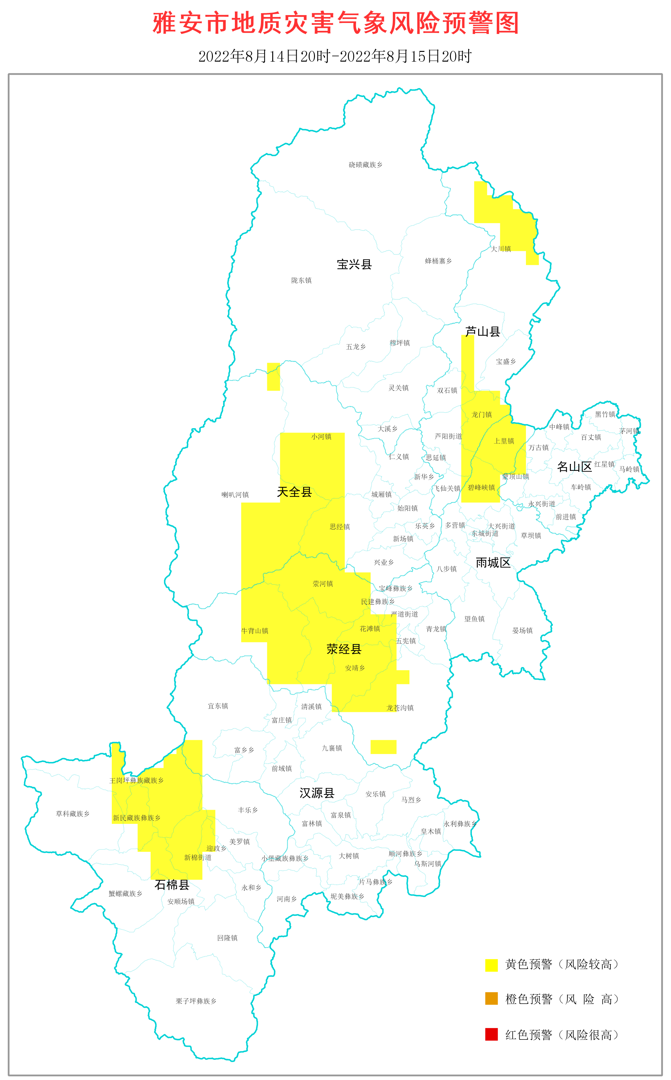 雅安市自然资源和规划局、市气象局2022年8月14日17时10分联合发布第34号地质灾害气象风险预警: