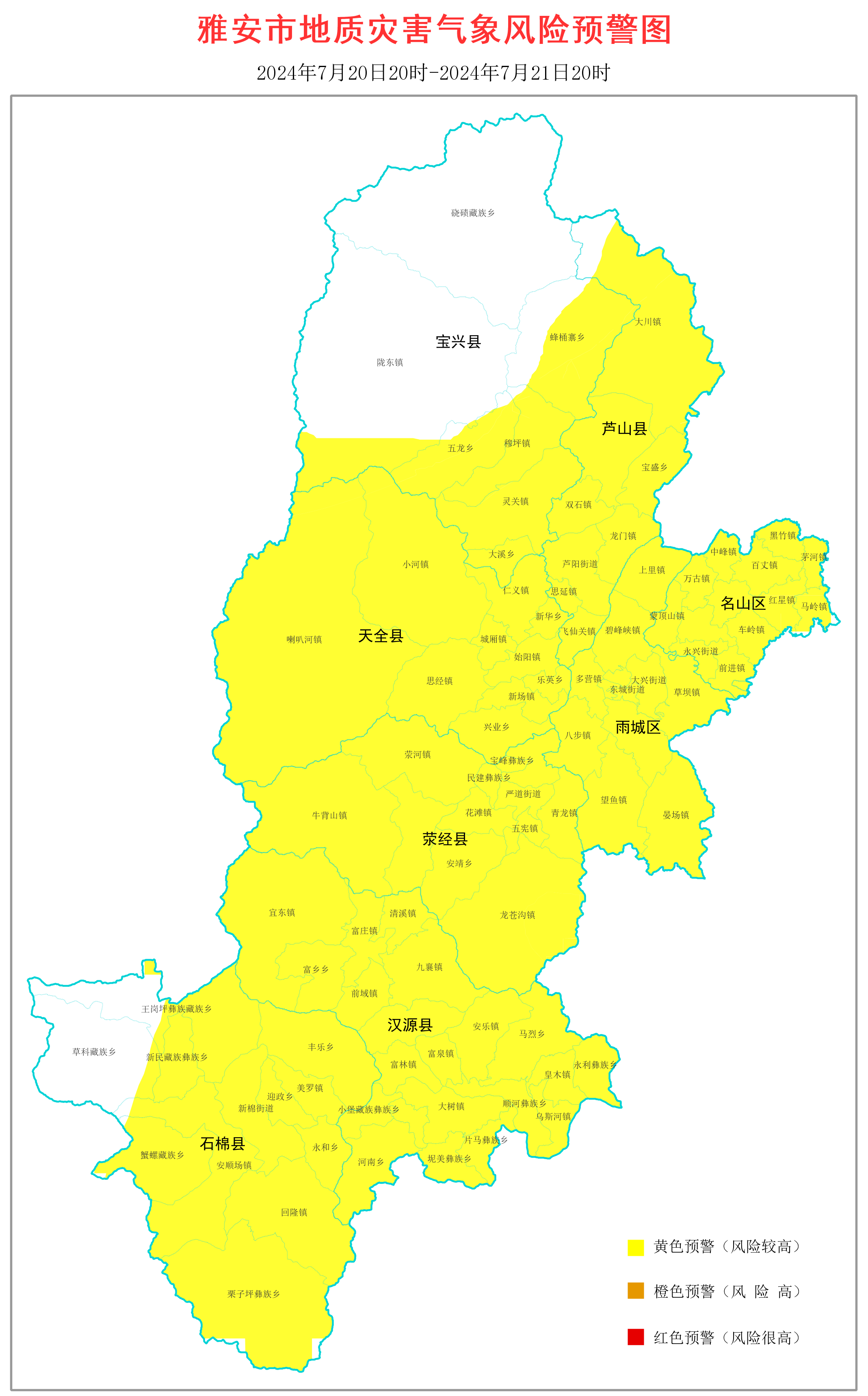 7月20日20时-7月21日20时,雨城区,名山区,荥经县,汉源县,石棉县,天全县,芦山县,宝兴县穆坪镇、灵关镇、陇东镇、蜂桶寨乡、五龙乡、大溪乡发生地质灾害的气象风险较高(黄色预警),请重点防范。