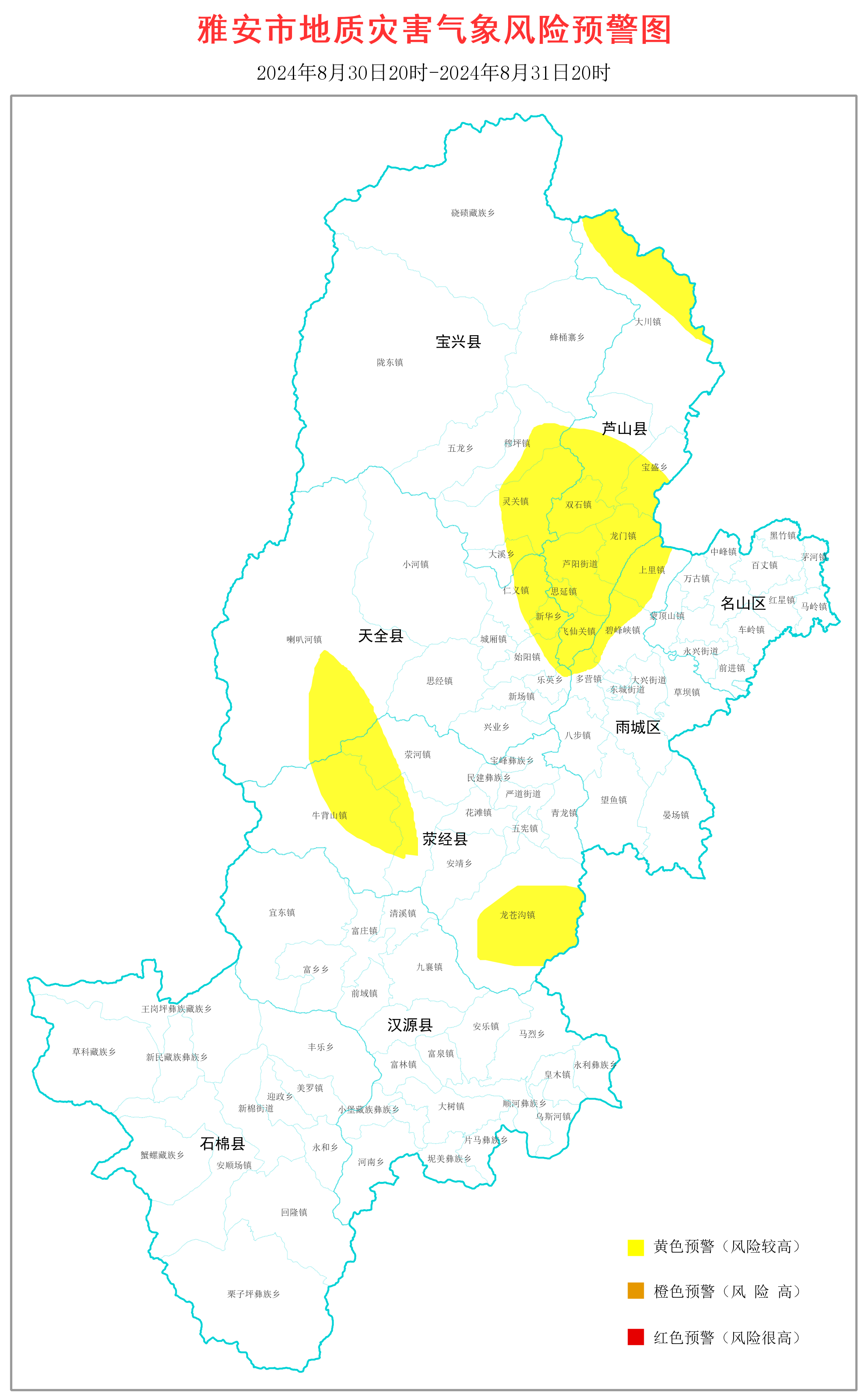 8月30日20时-8月31日20时,雨城区上里镇、多营镇、碧峰峡镇,荥经县龙苍沟镇、牛背山镇、荥河镇、泗坪乡,天全县始阳镇、喇叭河镇、仁义镇、乐英乡、新华乡,芦山县芦阳街道、飞仙关镇、双石镇、太平镇、大川镇、龙门镇、思延镇、宝盛乡,宝兴县穆坪镇、灵关镇、大溪乡发生地质灾害的气象风险较高(黄色预警),请重点防范。