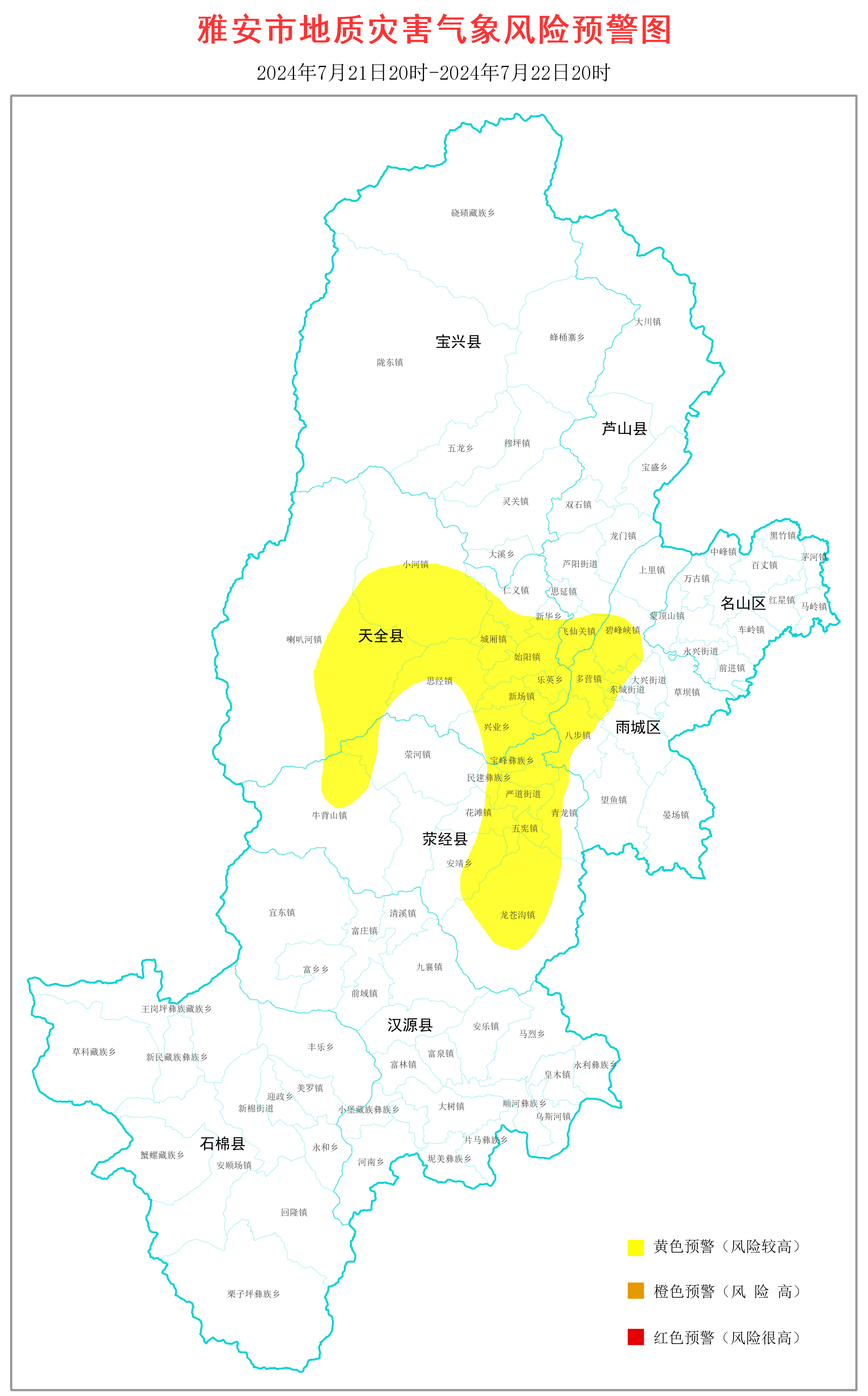 7月21日20时-7月22日20时,雨城区东城街道、西城街道、河北街道、大兴街道、多营镇、碧峰峡镇、周公山镇、八步镇,荥经县严道街道、花滩镇、龙苍沟镇、牛背山镇、新添镇、青龙镇、荥河镇、五宪镇、安靖乡、民建彝族乡、宝峰彝族乡,天全县城厢镇、始阳镇、思经镇、喇叭河镇、小河镇、仁义镇、新场镇、乐英乡、新华乡、兴业乡,芦山县芦阳街道、飞仙关镇发生地质灾害的气象风险较高(黄色预警),请重点防范。