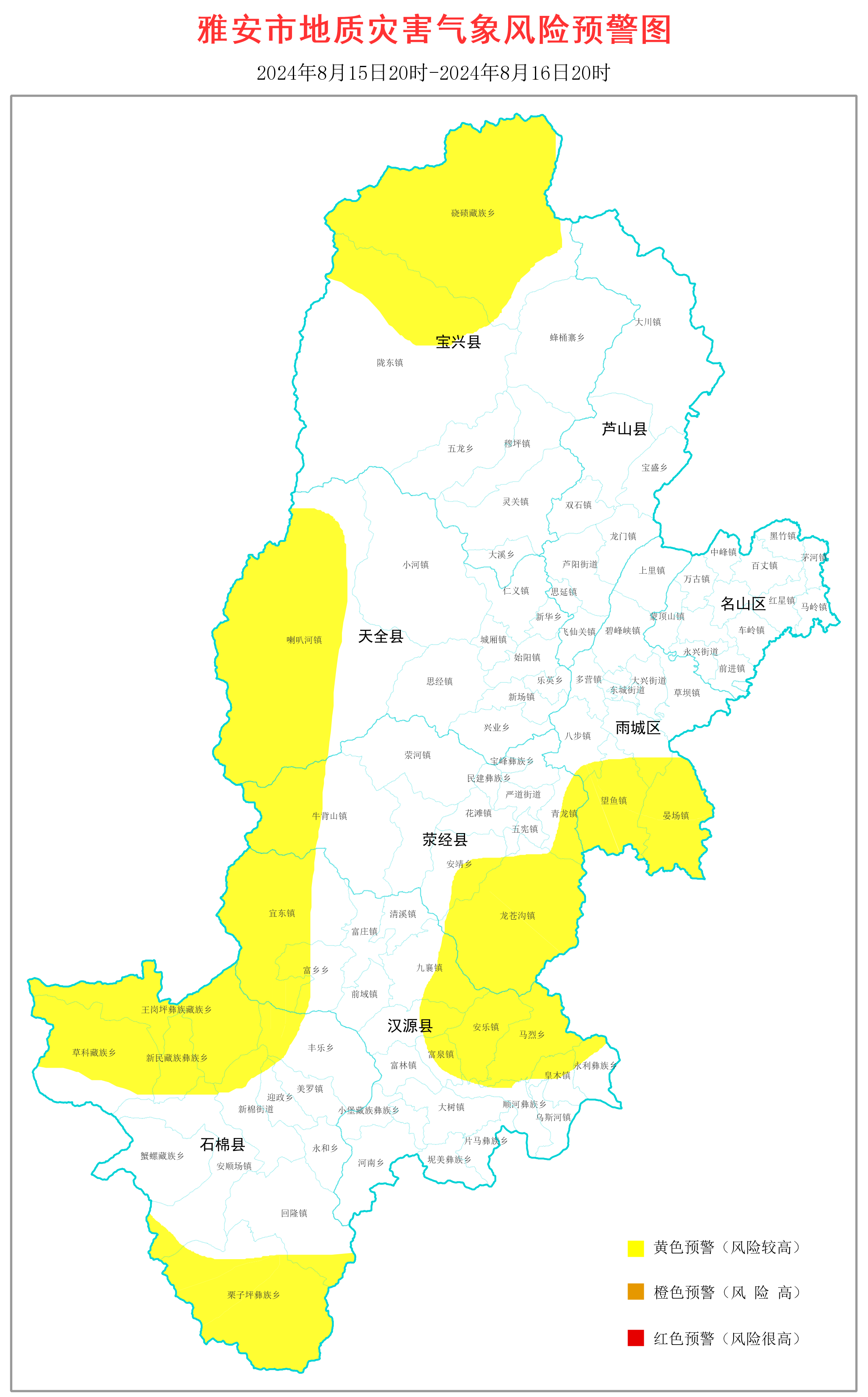 8月15日20时-8月16日20时,雨城区晏场镇、望鱼镇、周公山镇、八步镇,荥经县龙苍沟镇、牛背山镇、青龙镇、安靖乡,汉源县九襄镇、宜东镇、皇木镇、富泉镇、唐家镇、安乐镇、富乡乡、马烈乡、永利彝族乡、顺河彝族乡,石棉县新棉街道、回隆镇、美罗镇、安顺场镇、栗子坪彝族乡、迎政乡、丰乐乡、新民藏族彝族乡、草科藏族乡、王岗坪彝族藏族乡,天全县喇叭河镇,宝兴县陇东镇、硗碛藏族乡发生地质灾害的气象风险较高(黄色预警),请重点防范。