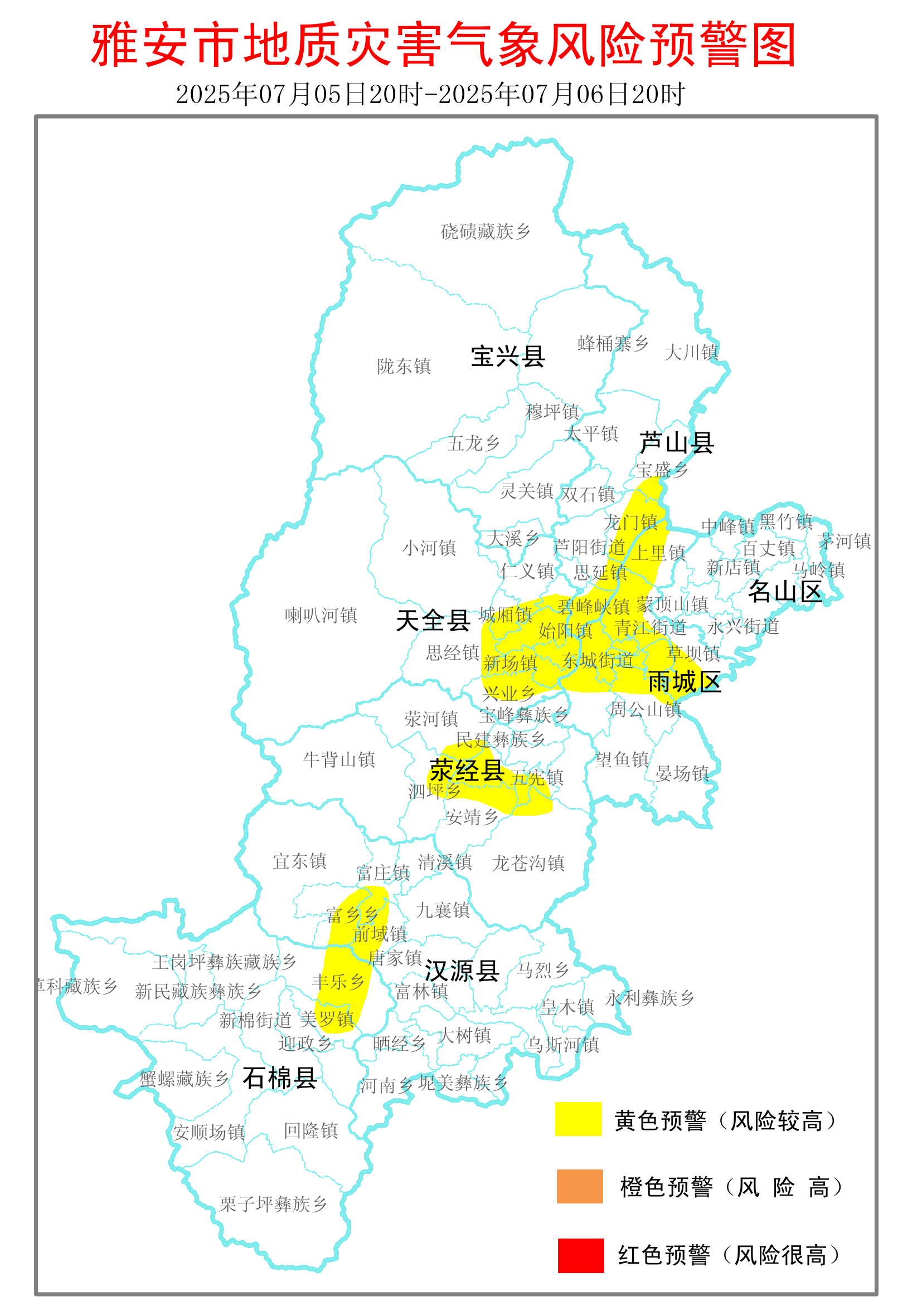 因近期强降雨土壤含水量已饱和,地质灾害具有滞后性,7月05日20时-7月06日20时,雨城区东城街道、西城街道、河北街道、青江街道、大兴街道、草坝镇、上里镇、多营镇、碧峰峡镇、周公山镇、八步镇,荥经县花滩镇、龙苍沟镇、青龙镇、荥河镇、五宪镇、安靖乡、泗坪乡,汉源县富庄镇、前域镇、富乡乡,石棉县美罗镇、丰乐乡,天全县城厢镇、始阳镇、思经镇、仁义镇、新场镇、乐英乡、新华乡、兴业乡,芦山县芦阳街道、飞仙关镇、龙门镇、宝盛乡发生地质灾害的风险较高(黄色预警),请重点防范。