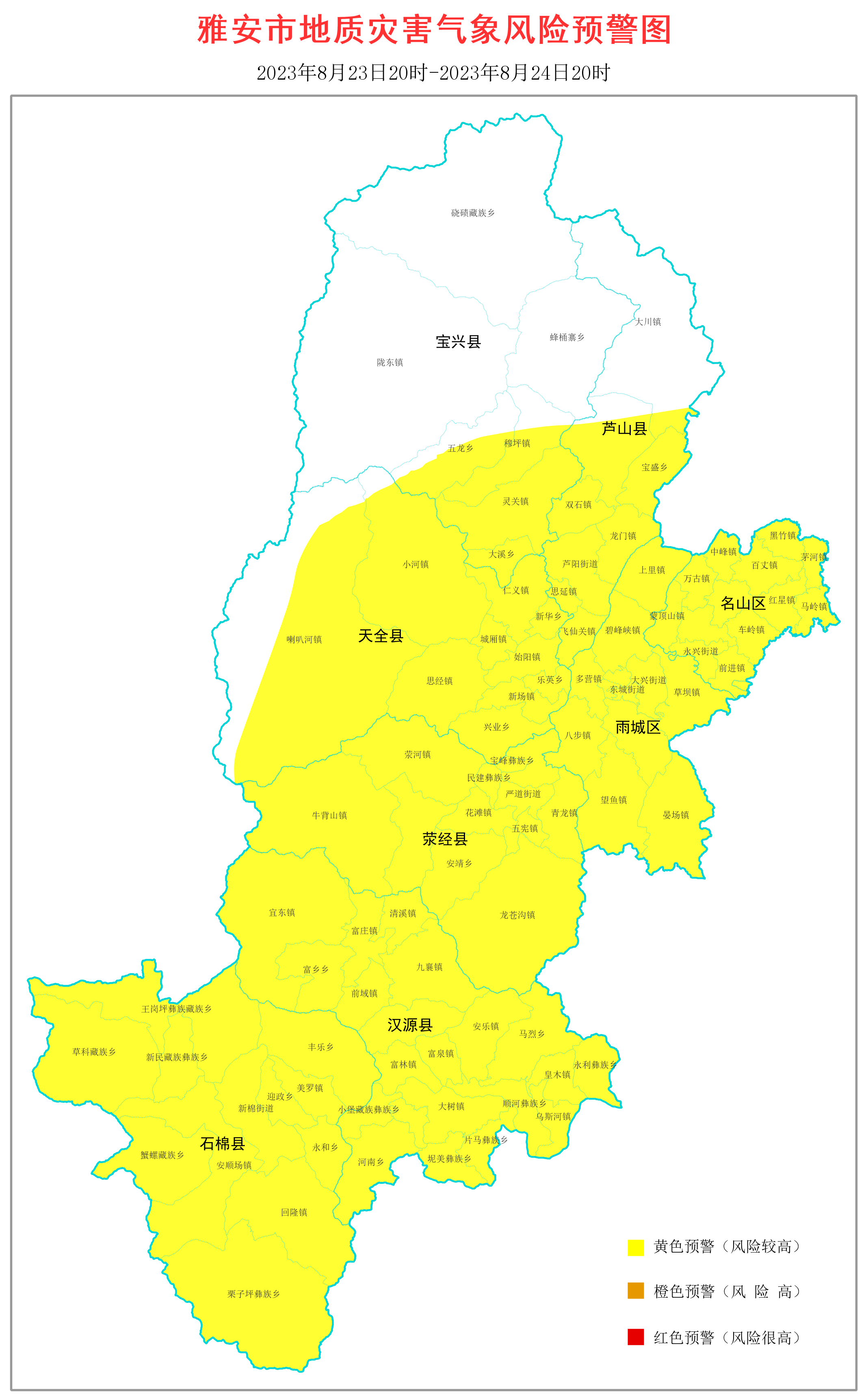 雅安市自然资源和规划局、市气象局2023年8月23日16时40分联合发布第36号地质灾害气象风险预警: