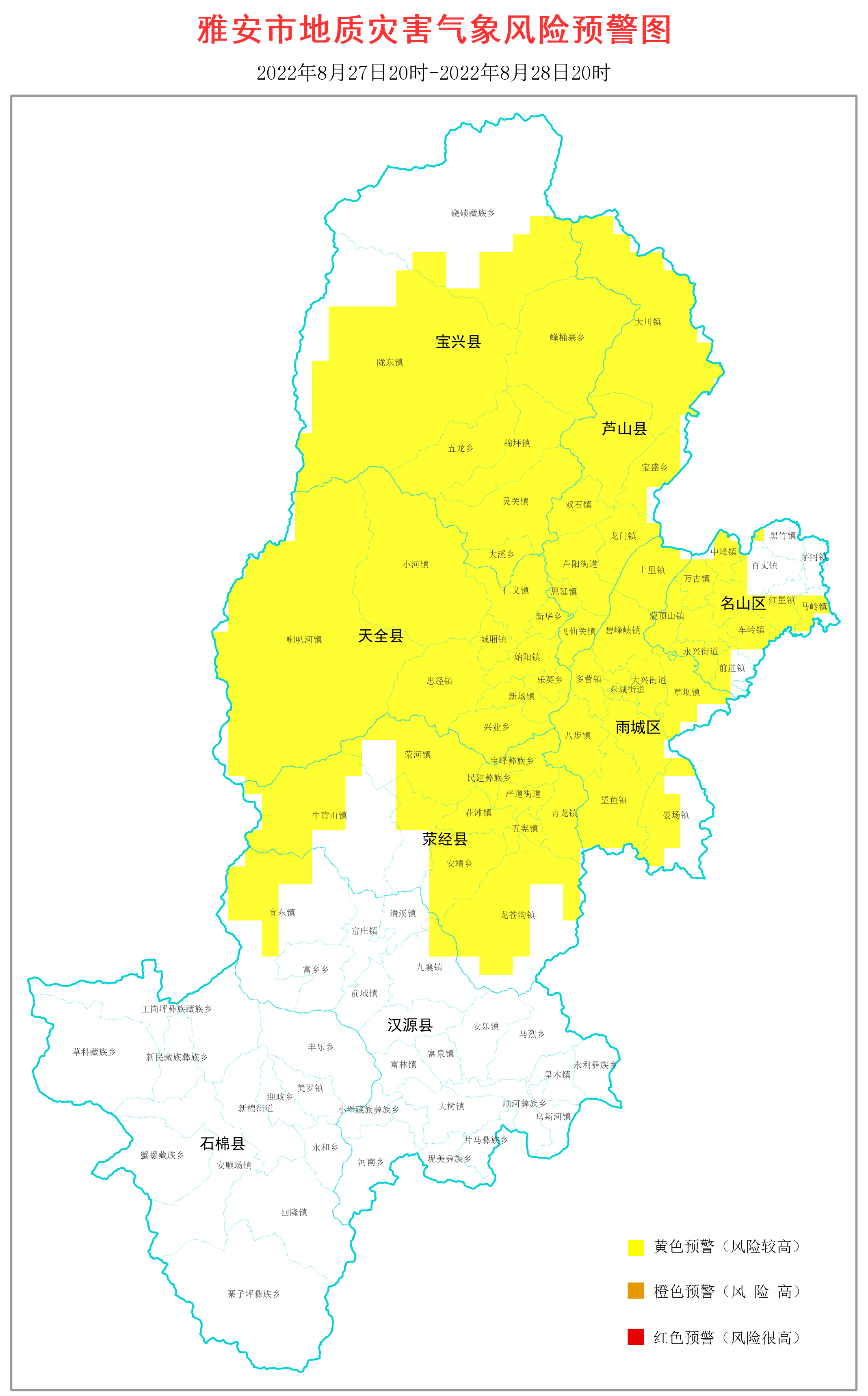 雅安市自然资源和规划局、市气象局2022年8月27日17时05分联合发布第42号地质灾害气象风险预警: