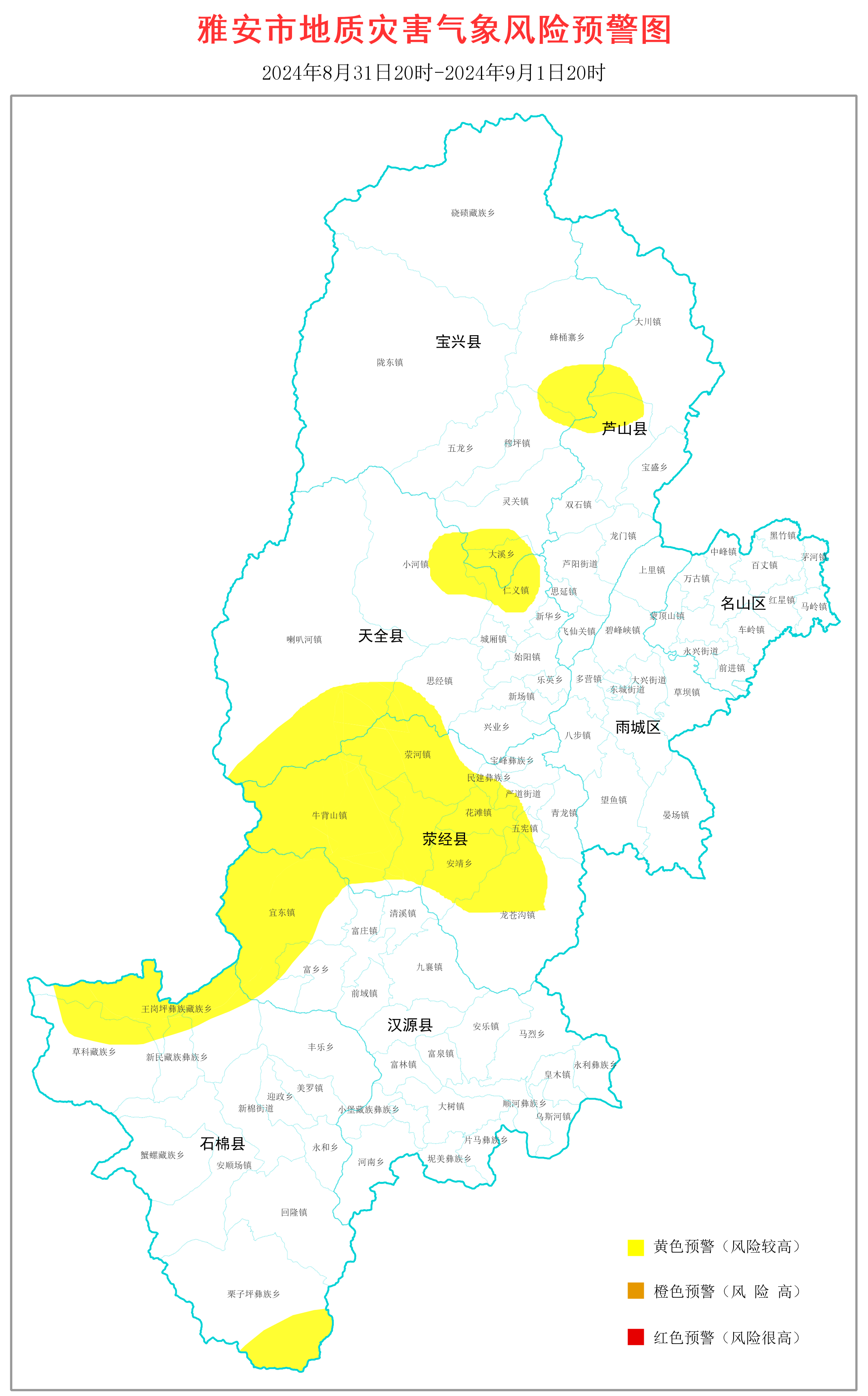 8月31日20时-9月1日20时,荥经县严道街道、花滩镇、龙苍沟镇、牛背山镇、荥河镇、五宪镇、安靖乡、民建彝族乡、泗坪乡,汉源县宜东镇、富庄镇、富乡乡,石棉县栗子坪彝族乡、新民藏族彝族乡、草科藏族乡、王岗坪彝族藏族乡,天全县思经镇、喇叭河镇、小河镇、仁义镇,芦山县太平镇、大川镇,宝兴县穆坪镇、灵关镇、蜂桶寨乡、大溪乡发生地质灾害的气象风险较高(黄色预警),请重点防范。