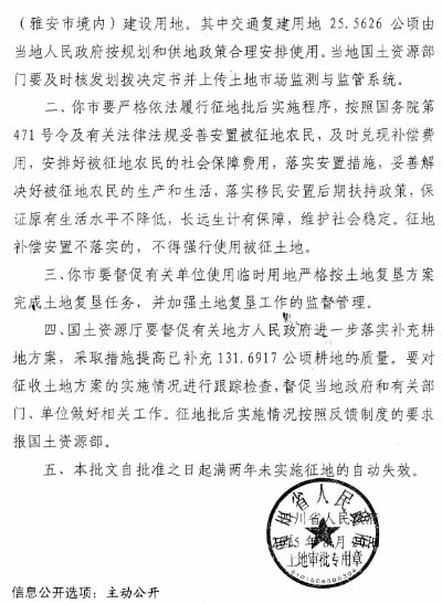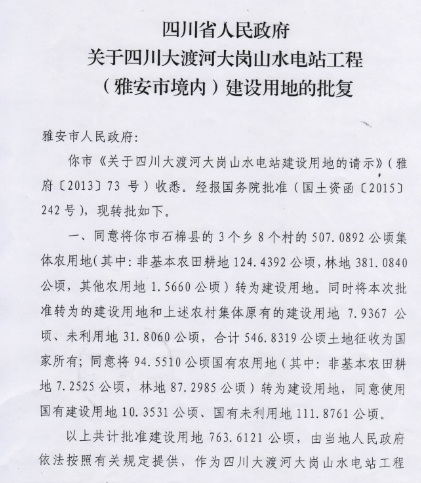 位置:首页>文章信息>四川省人民政府关于四川大渡河大岗山水电站工程(雅安市境内)建设用地的批复